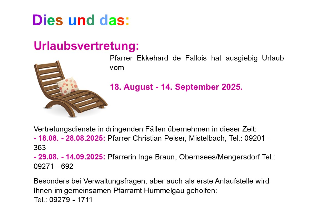 Pfarrer Pfarrer: Ekkehard de Fallois Telefon: 09201 95216 Ich bin für Sie da und nehme mir Zeit. eMail: ekkeharddefallois@gmx.de